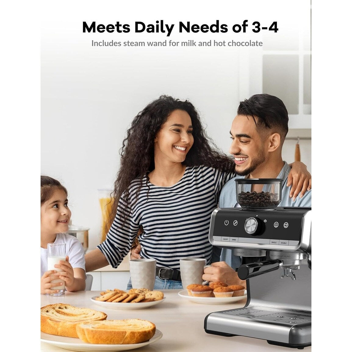 【Machine à expresso professionnelle 20 bars】 - Notre machine à expresso semi-automatique tout-en-un est équipée d'une pompe professionnelle de 20 bars et d'un puissant moteur de 1450 W, assurant une extraction optimale pour une expérience café plus riche et plus aromatique. Avec cette machine à café polyvalente, vous pouvez facilement préparer des cappuccinos mousseux, des lattes onctueux ou des espressos robustes, que ce soit à la maison ou au bureau. 【Machine à café avec broyeur】 - La cafetière est équipée d'un broyeur à meules coniques en acier inoxydable avec 30 réglages de mouture ajustables, vous permettant de personnaliser la taille de la mouture de fine à grossière. Son design antistatique réduit le désordre et assure une mouture uniforme. 【Bâton à émulsion de lait professionnel】 - Le puissant bâton à vapeur rotatif à 360 degrés vous permet de texturer facilement le lait en micro-mousse, améliorant le goût et facilitant la création d'art café à la maison. Obtenez une mousse de lait parfaite pour les cappuccinos ou du lait chaud pour les lattes, apportant une expérience de café à votre café et stimulant votre créativité pour créer des motifs uniques en mousse de lait. 【Contrôle précis de la température et grand réservoir d'eau】 - La machine à expresso est équipée d'un contrôle intelligent de la température PID, garantissant que l'eau est délivrée à la température précise pour une extraction d'espresso optimale. Elle comprend également un réservoir d'eau amovible de 95 oz, améliorant la commodité et l'efficacité pendant le processus de brassage et réduisant le besoin de recharges fréquentes. 【Facile à utiliser et à entretenir】 - Avec un panneau de commande simple et clair pour sélectionner la vapeur, l'eau chaude et les tasses simples ou doubles, cette machine à cappuccino avec broyeur est extrêmement facile à utiliser. Son design élégant et compact s'adapte à toutes les tailles de cuisine et dispose d'un réservoir d'eau et d'un bac à égouttement amovibles pour un nettoyage facile.