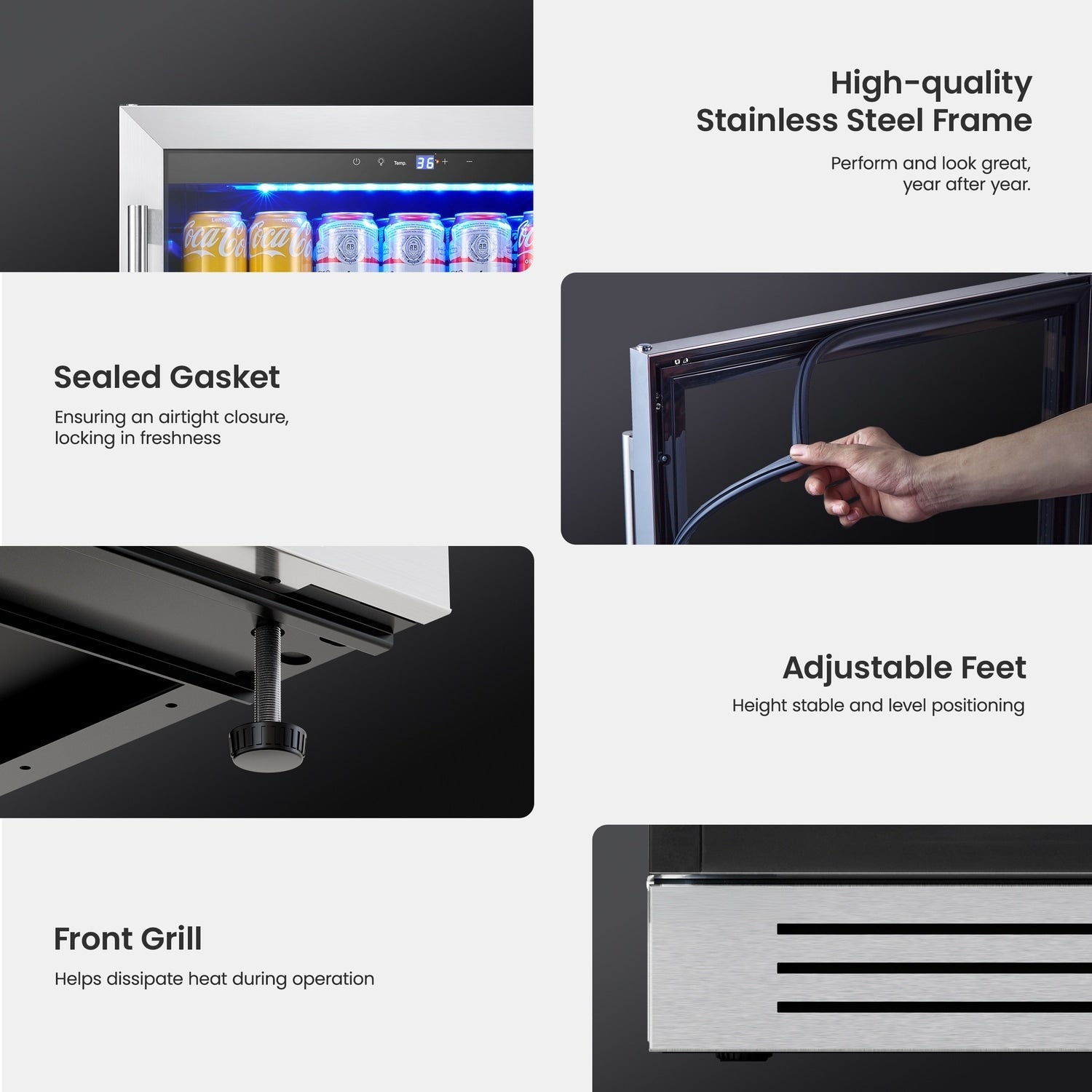 - Design élégant et sécurisé : Le réfrigérateur à boissons est doté d'une porte en acier inoxydable élégante avec une poignée en forme de L et un double vitrage résistant aux UV. Son esthétique moderne s'intègre à n'importe quel décor.
