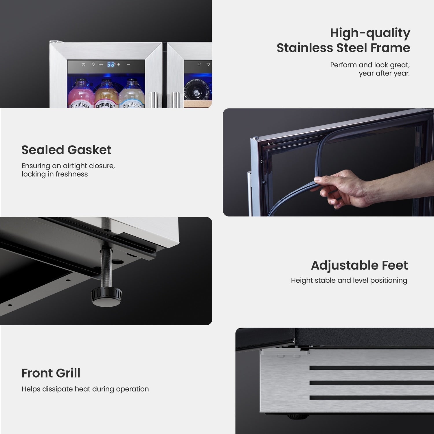- Design sûr et élégant : la construction en verre résistant aux UV et en acier inoxydable assure une grande durabilité. Ce refroidisseur à vin et autres boissons s'intègre également à n'importe quel décor grâce à son design épuré.