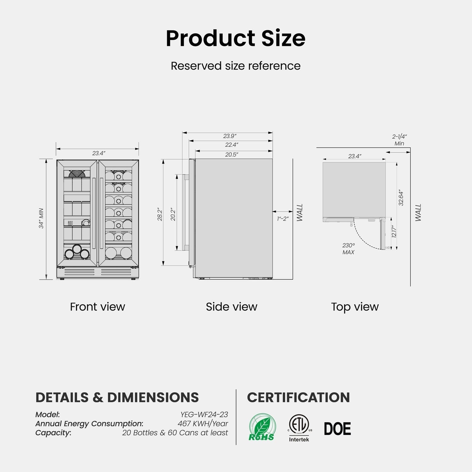 - Capacité généreuse : Avec une capacité de 20 bouteilles de Bordeaux standard de 750 ml et jusqu'à 60 canettes de boissons de 355 ml, le réfrigérateur à vin et boissons Yeego répond à tous vos besoins pour vos réceptions. Le côté droit du réfrigérateur dispose de six étagères amovibles en bois pour le vin, tandis que le côté gauche offre 3 grilles en fil d'acier réglables pour les boissons, offrant ainsi une solution flexible pour le rangement de divers formats de bouteilles et de canettes.