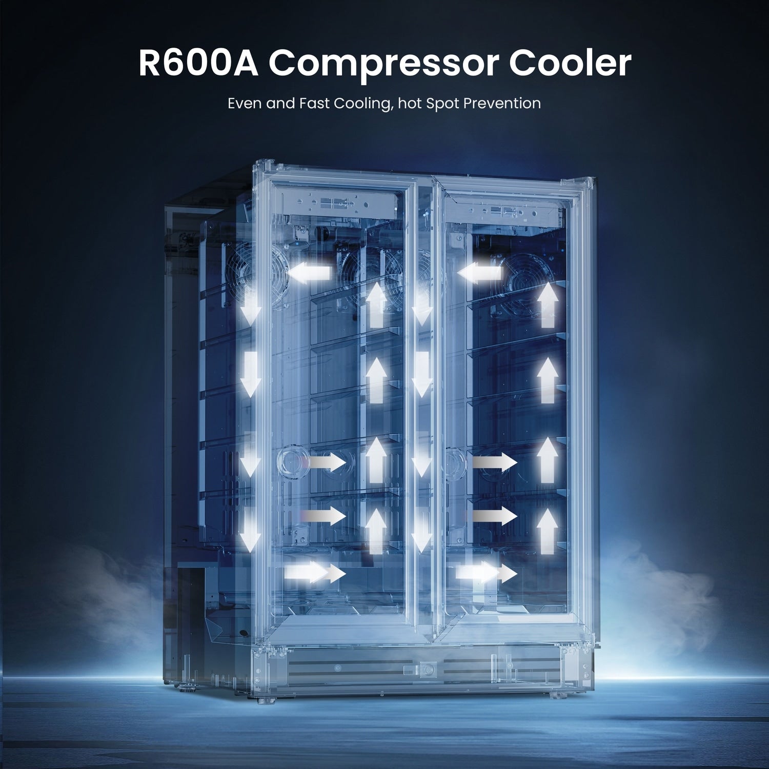 - Refroidissement écologique et efficace : Doté du réfrigérant R600a et certifié DOE, le refroidisseur de boissons et de vin Yeego offre un refroidissement rapide et uniforme tout en économisant l’énergie. Le système de ventilation frontale améliore la circulation de l’air et la dissipation de la chaleur, tandis que le filtre à charbon actif élimine les odeurs, maintenant un environnement frais à l’intérieur de ce réfrigérateur à vin et boissons.