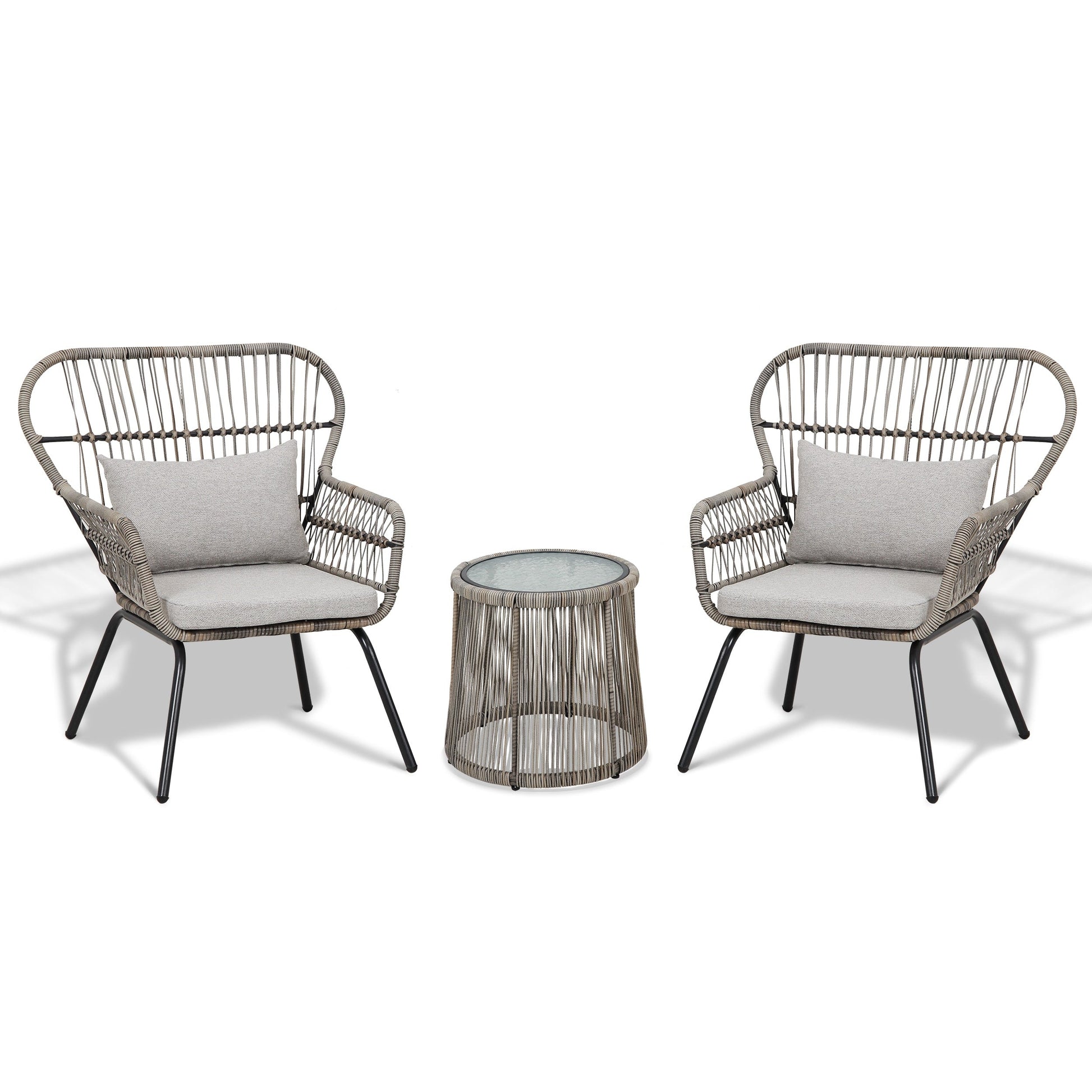 Ensemble de bistro en osier tressé pour extérieur, 3 pièces, ensemble de chaises de patio en rotin résistant aux intempéries avec coussins.