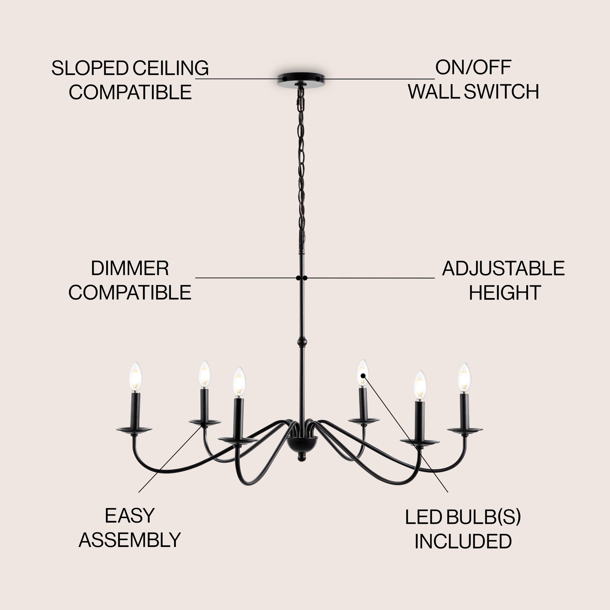 - Prise pour 6 ampoules, compatible avec les ampoules de type 'B' 40W, les ampoules fluo-compactes 13W ou les ampoules LED 9W.