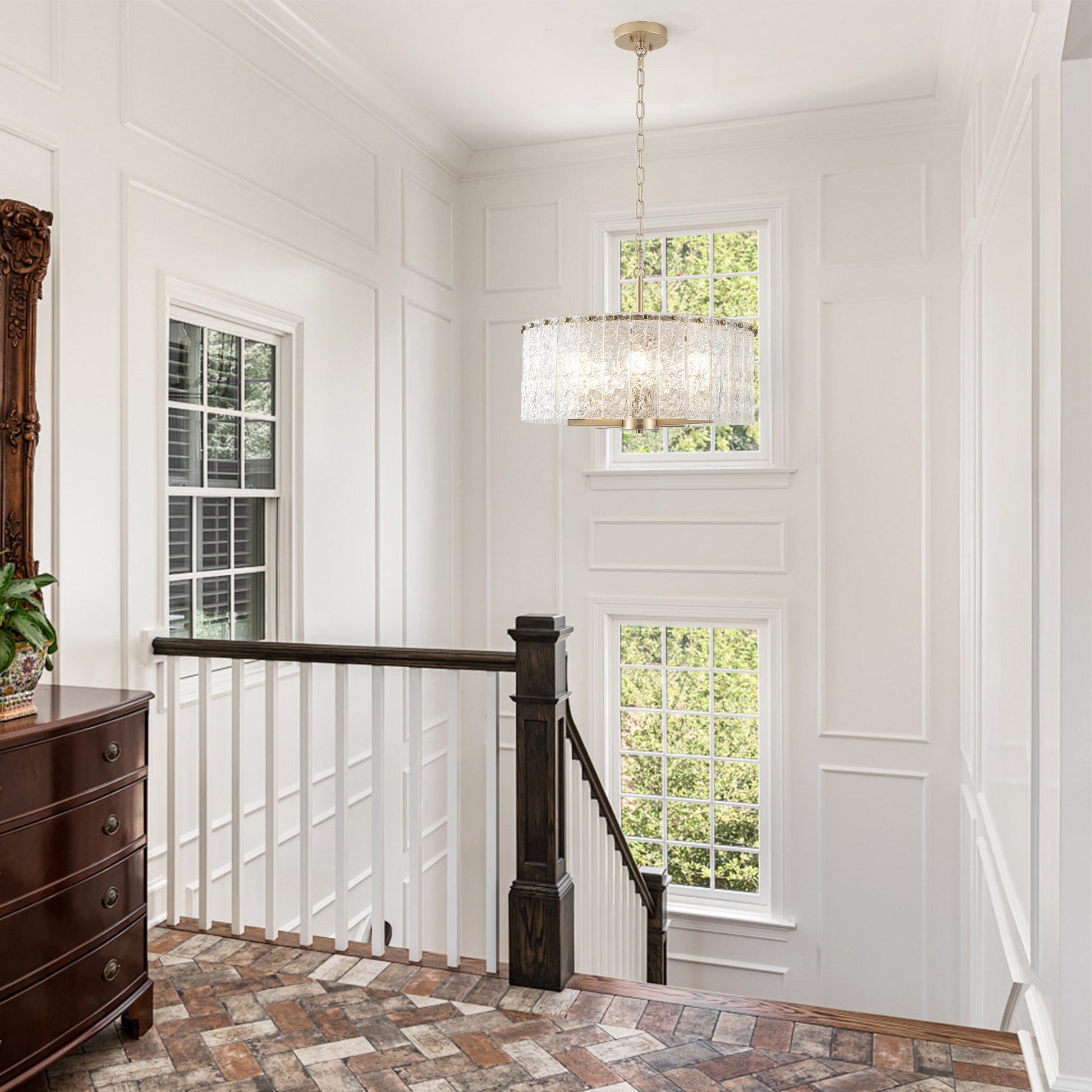 Illuminez votre îlot de cuisine avec élégance grâce à notre suspension en forme de tambour. Avec son design époustouflant et ses accents en cristal, ce luminaire dégage sophistication et luxe. Avec cinq lumières et une direction lumineuse vers le haut, il offre un éclairage ample tout en ajoutant une touche de glamour à votre espace. Fabriqué à partir de métal, de verre et de véritable cristal chinois K9 de haute qualité, il garantit durabilité et esthétique luxueuse. La longueur réglable permet un positionnement flexible, tandis que sa compatibilité avec les plafonds en pente offre des options d'installation polyvalentes. Parfaite pour les endroits secs, cette suspension allie style et fonctionnalité pour rehausser l'ambiance de toute cuisine. Veuillez noter : les ampoules ne sont pas incluses.