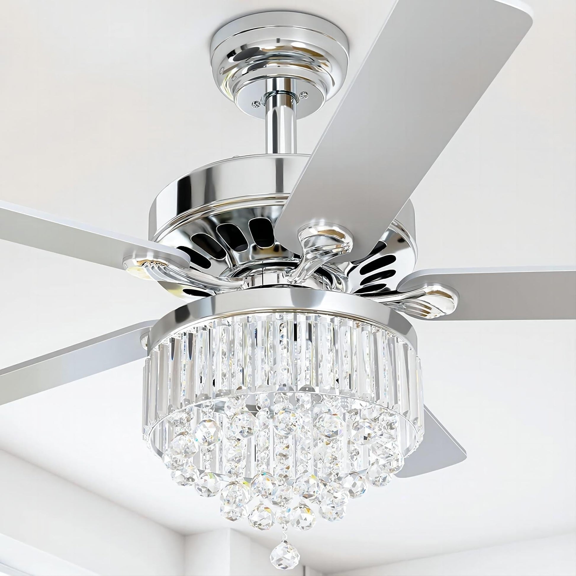 Ventilateur de plafond avec lustre en cristal à 52 pouces, 5 pales en bois et télécommande
