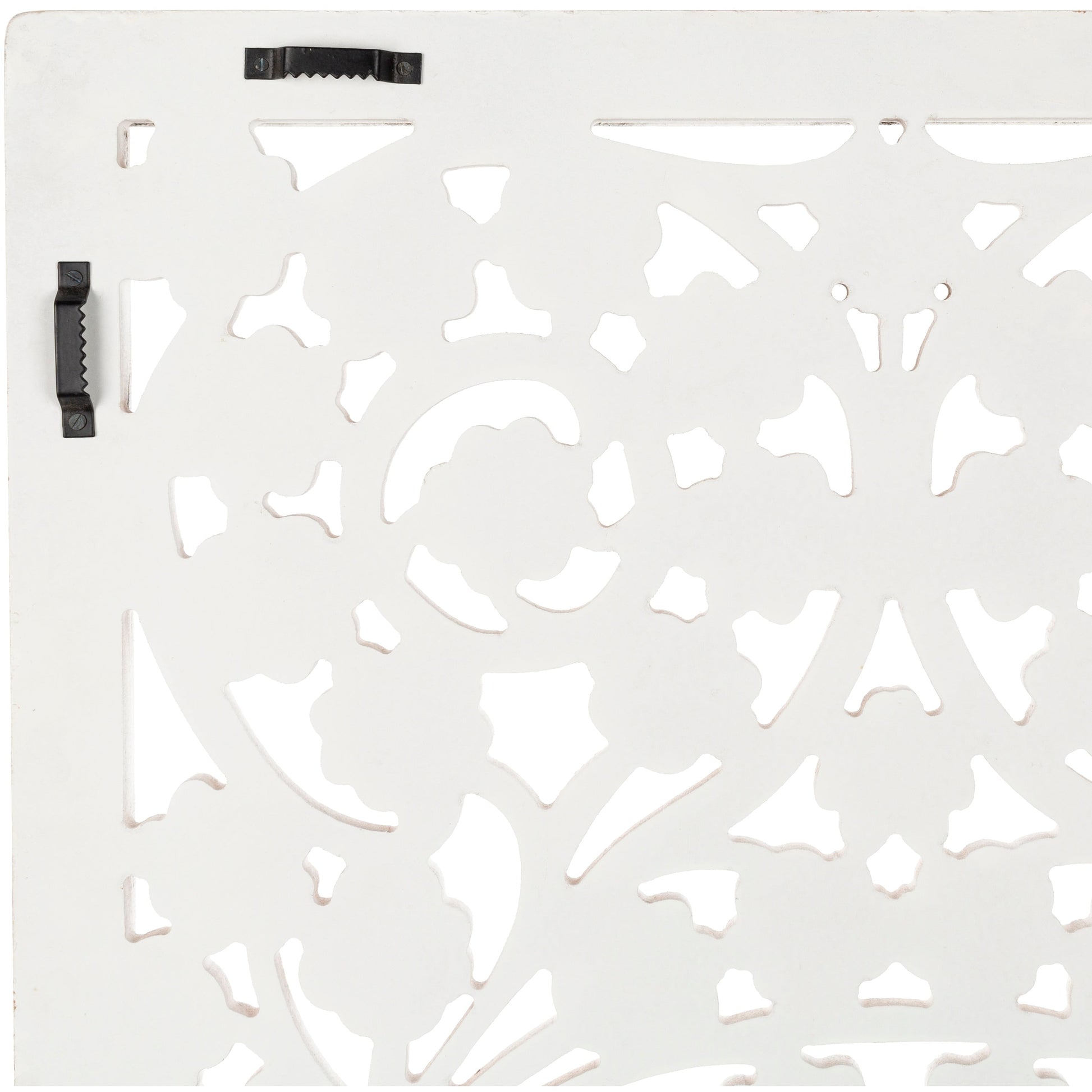 Apportez une touche d'exotisme à votre intérieur avec ce panneau mural d'une beauté à couper le souffle. Chaque panneau est sculpté à la main avec des détails élaborés et agrémenté de l'art traditionnel des miroirs indiens. La finition blanche vieillie ajoute une touche contemporaine et polyvalente. Idéal pour un espace de caractère, ce panneau peut être accroché verticalement ou horizontalement.