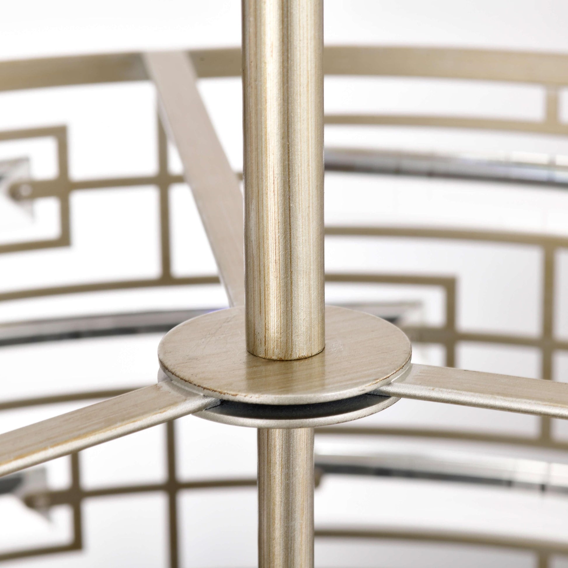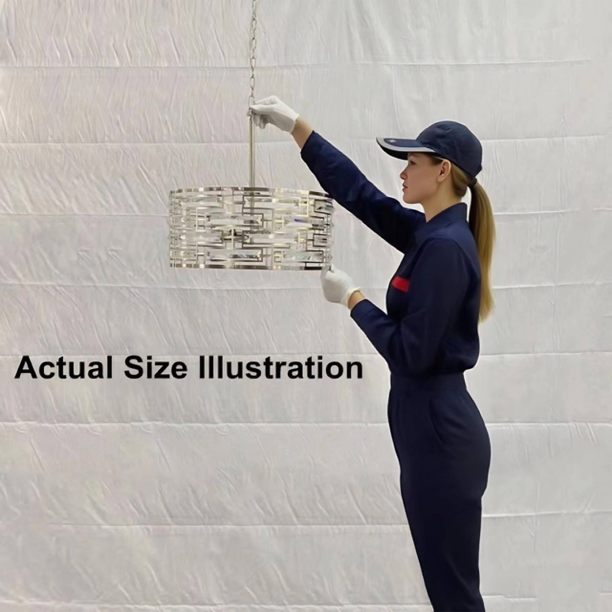 - Appareil : 50,8 cm de diamètre x 45,7 cm de hauteur ; Abat-jour : 50,8 cm de diamètre x 21,6 cm de hauteur ; Plaque de plafond : 13 cm de diamètre x 2,5 cm de hauteur ; Hauteur de suspension maximale (du plafond au bas de l'appareil) : 151 cm, hauteur modifiable.