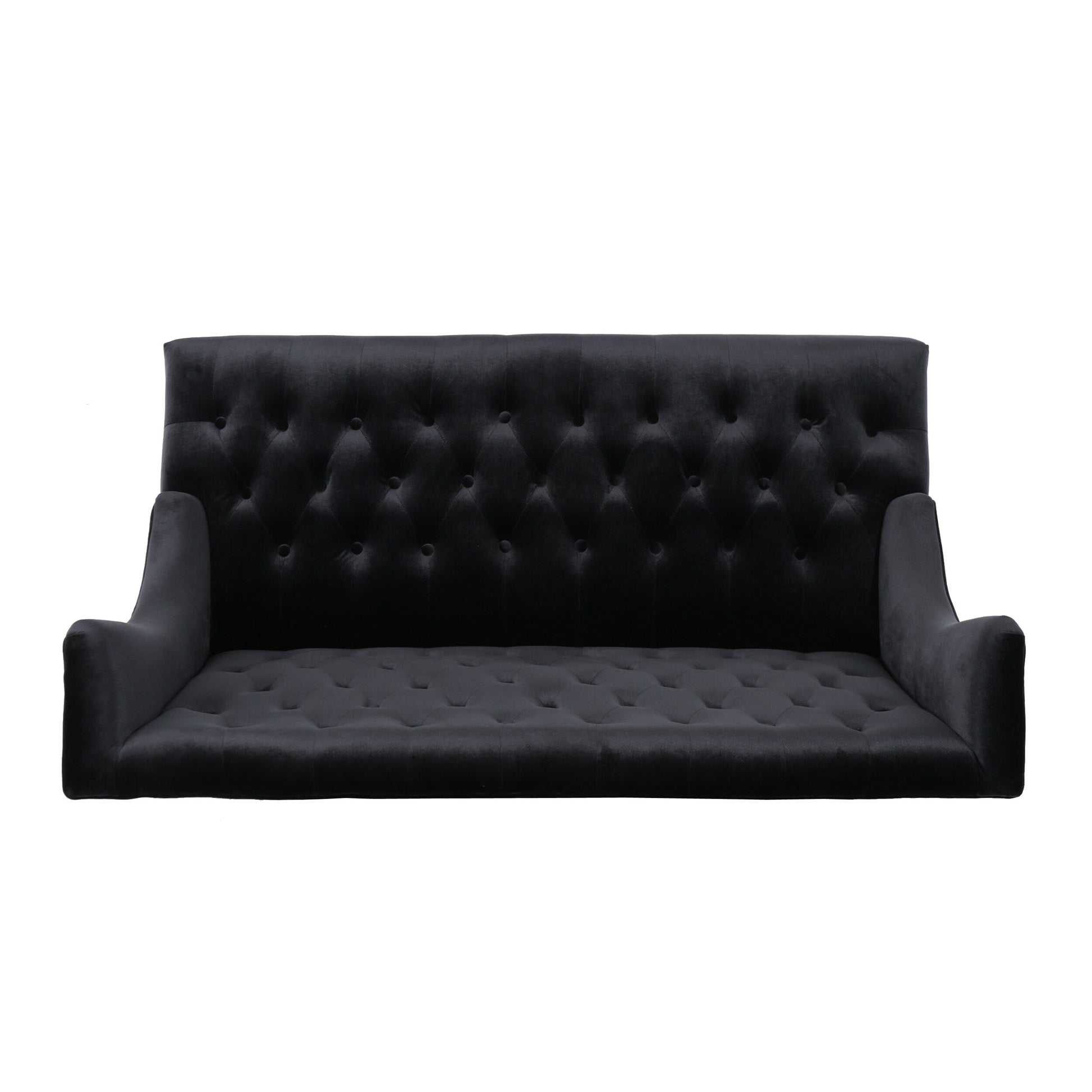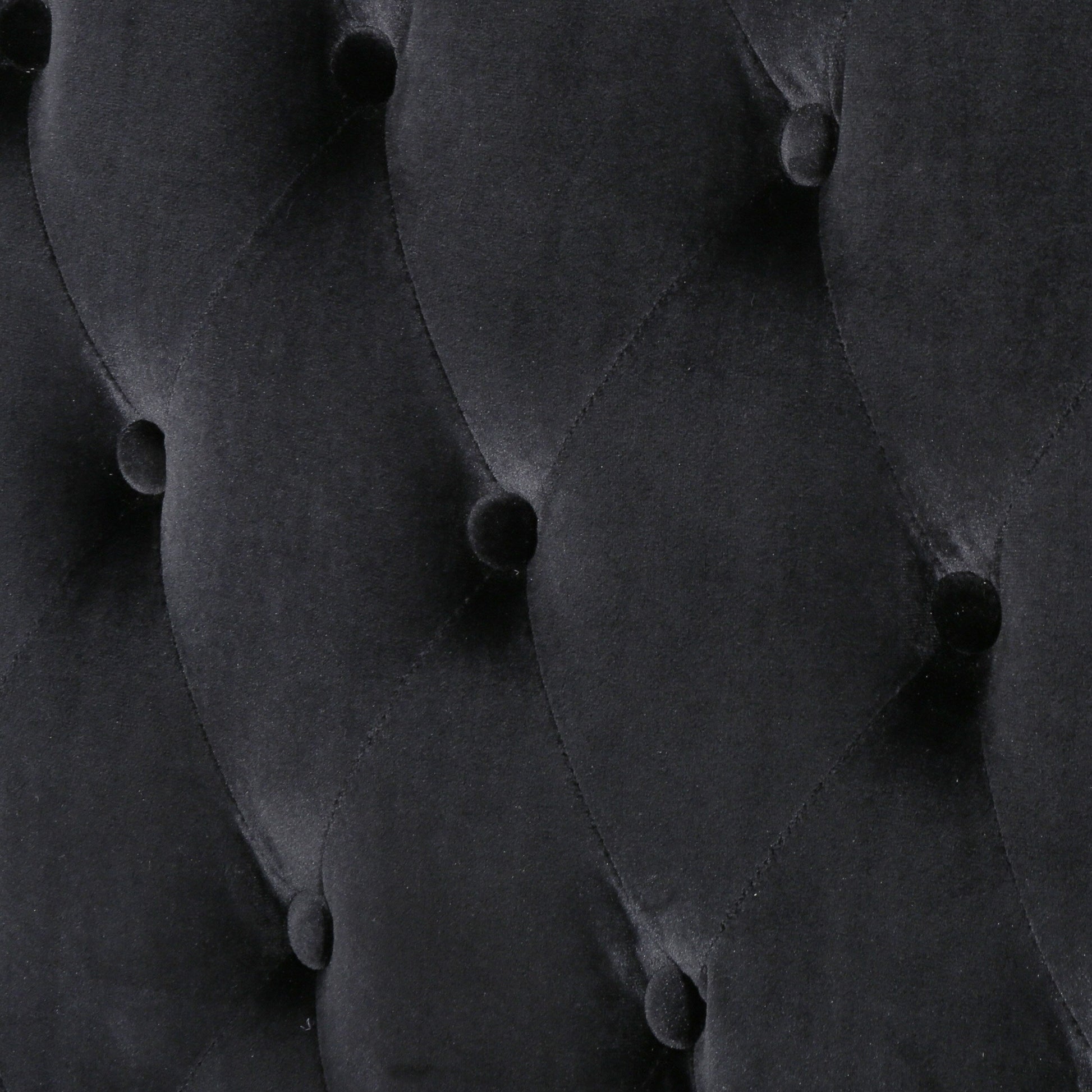 Canapé deux places à dossier haut et accoudoirs capitonnés en velours noir.