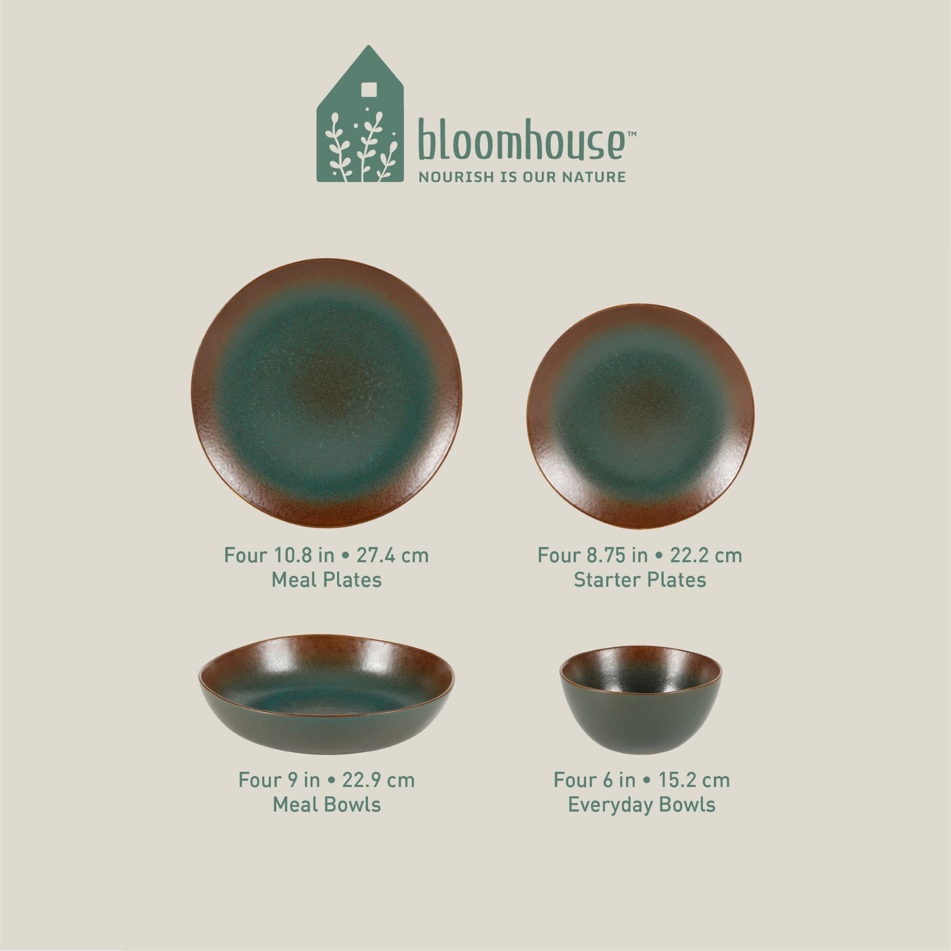 * Cet ensemble comprend quatre assiettes de repas de 28 cm (11 pouces), quatre assiettes de hors-d'œuvre de 20 cm (8 pouces), quatre bols de tous les jours de 15 cm (6 pouces) et quatre bols de repas de 23 cm (9 pouces).