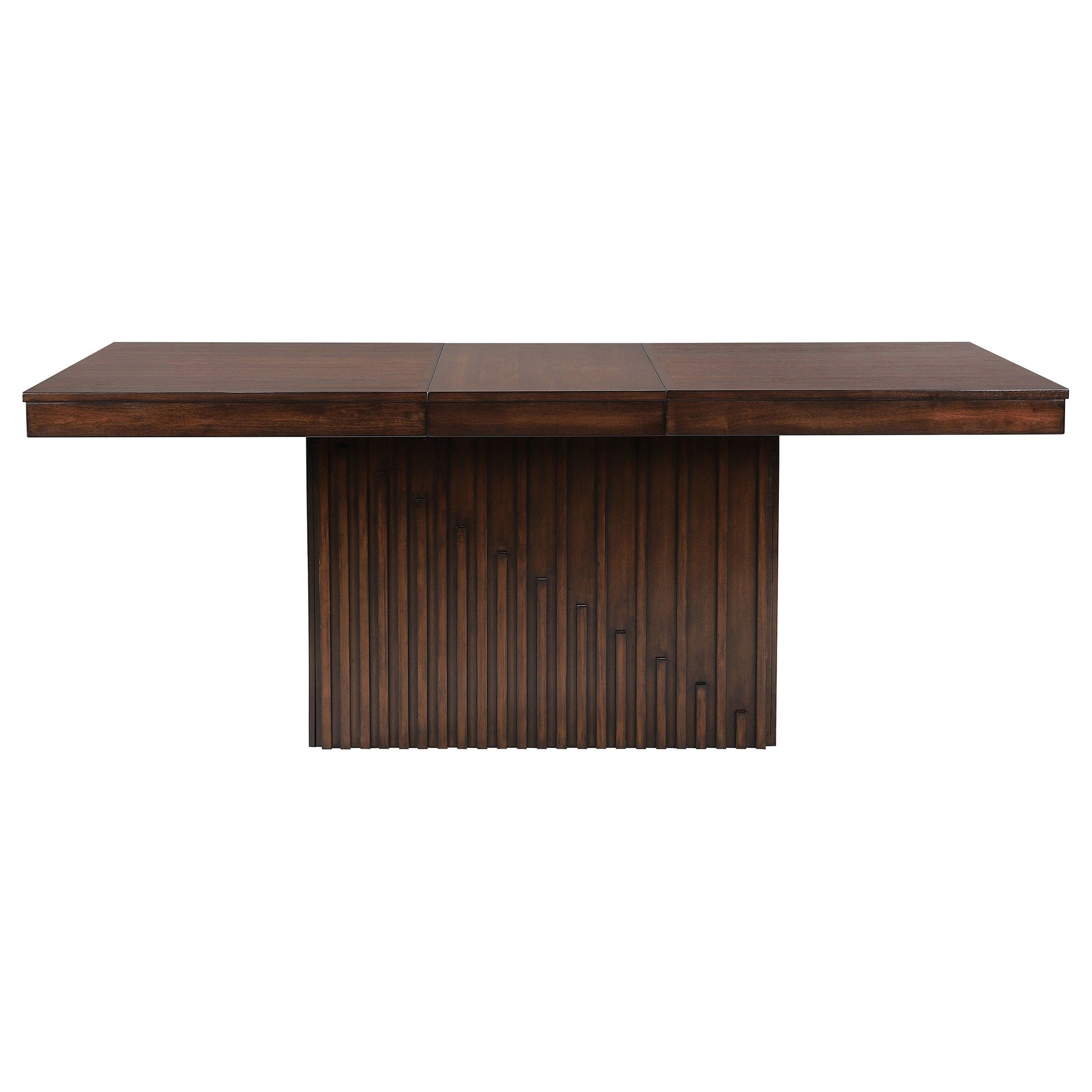 Créez un espace de rassemblement élégant et chaleureux pour la famille et les amis avec un ensemble de table à manger moderne cinq pièces. Il présente un aspect et une sensation contemporains avec une finition en bois de chêne de mangue profonde et riche, complétant facilement les espaces repas décontractés et plus formels pour accueillir la famille ou offrir un lieu pour dîner avec des amis et des collègues. Son piètement sur colonne distinctif est accentué par des détails cannelés qui créent un motif fluide qui fait parfaitement écho aux dossiers des chaises, offrant un sentiment de cohésion à cet ensemble élégant. Les chaises sont d'une conception robuste, complètes d'un dossier incurvé et d'un siège rembourré recouvert d'un tissu brun clair qui offre un attrait neutre. La table peut confortablement accueillir quatre personnes et s'étend facilement pour en accueillir six adultes.