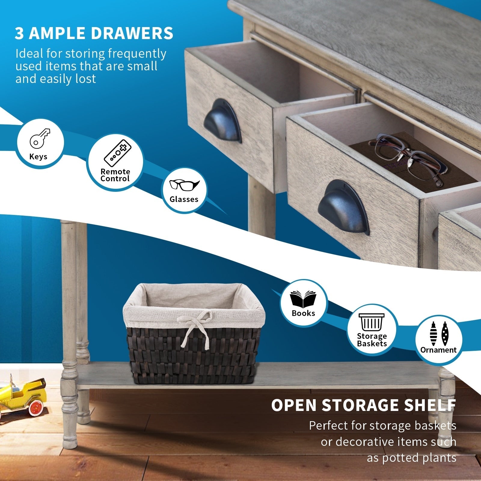 【FONCTIONNEL】Cette console d'entrée est idéale pour exposer des objets décoratifs tels que des vases, des cadres photo et des livres. Son étagère de rangement centrale offre un espace supplémentaire pour les magazines ou les petits objets délicats, tandis que les tiroirs offrent des options de rangement dissimulées.