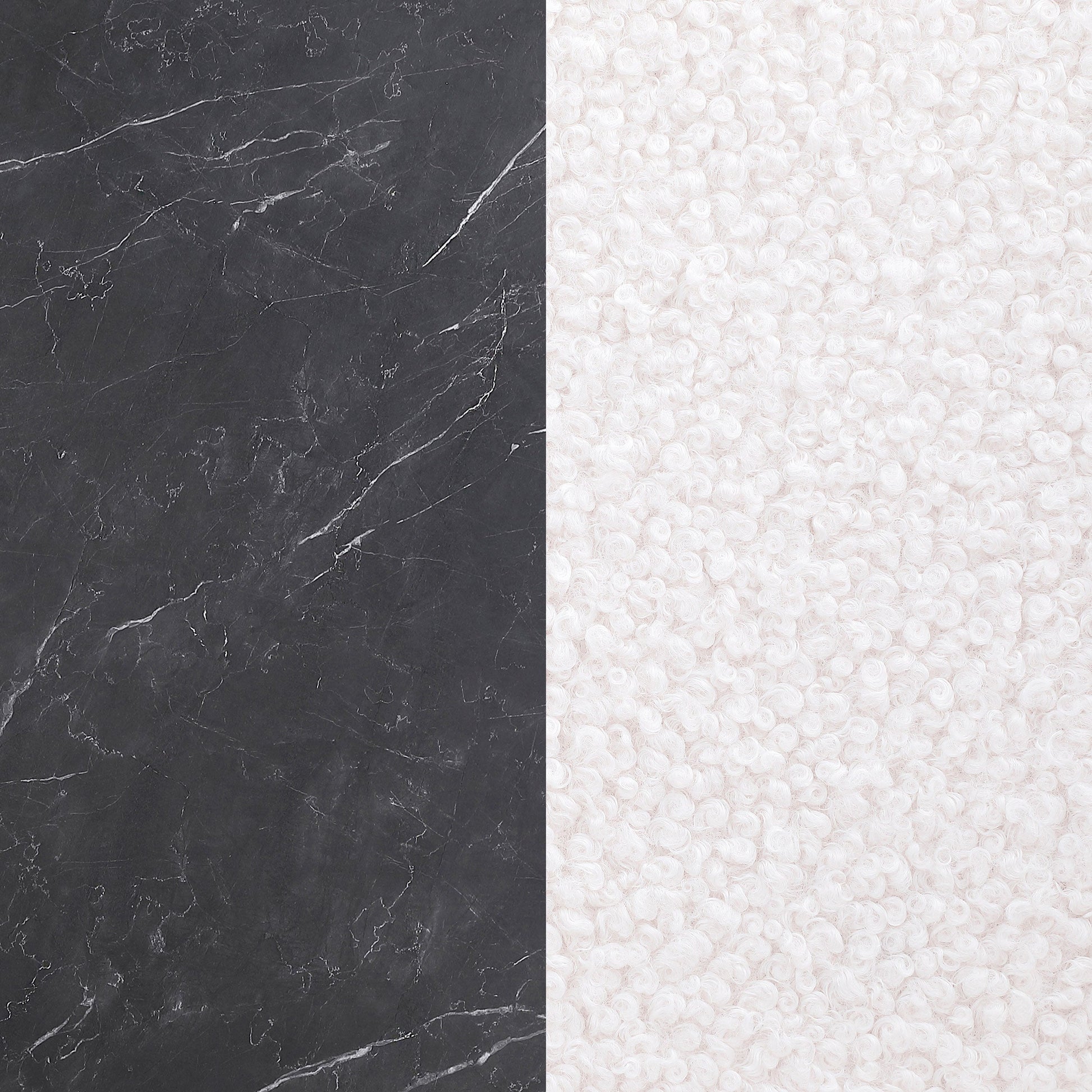 Reimaginez votre salle à manger avec le caractère frais et élégant d'un ensemble de salle à manger moderne cinq pièces. Centré autour d'une table ronde avec un plateau en marbre noir imitation, cet ensemble offre un contraste et une dimension saisissants dans une cuisine ou une salle à manger. Le plateau est en mélamine noire imprimée, conçue pour offrir un aspect impeccable à un prix abordable. Le piètement de la table est un piédestal en forme d'étoile en métal noir martelé, apportant une touche artistique à votre espace. Quatre chaises complètent l'ensemble, associant des pieds noirs martelés à un revêtement en tissu crème moelleux, offrant une texture charmante et un rembourrage confortable.
