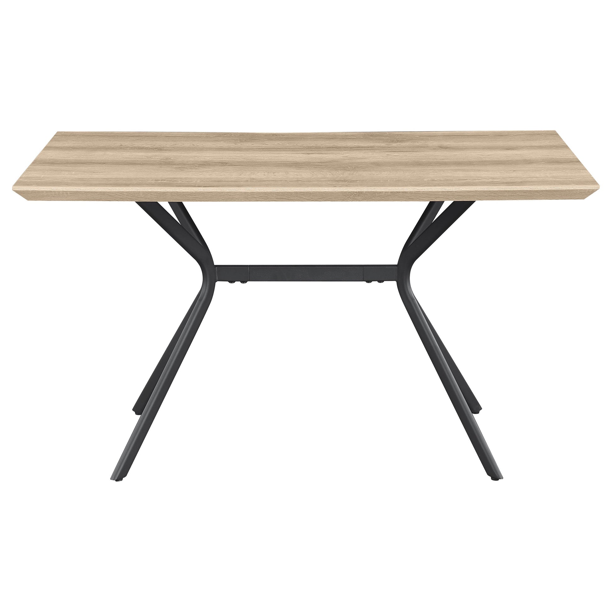 Rafraîchissez votre cuisine ou votre salle à manger avec une table à manger moderne et décontractée. Sa silhouette rectangulaire est polyvalente et élégante, parfaite pour les espaces multifonctionnels comme les coins repas et les salles à manger compactes. Elle possède un plateau en imitation bois brun moyen, fabriqué en mélamine pour une excellente durabilité et une résistance aux bosses et aux rayures. Un bord biseauté ajoute une touche de raffinement, idéale pour un espace contemporain et accueillant. Le piètement de la table comporte quatre pieds en V angulaires avec une barre de renfort, le tout dans une finition noire sur une structure métallique qui assure la stabilité.