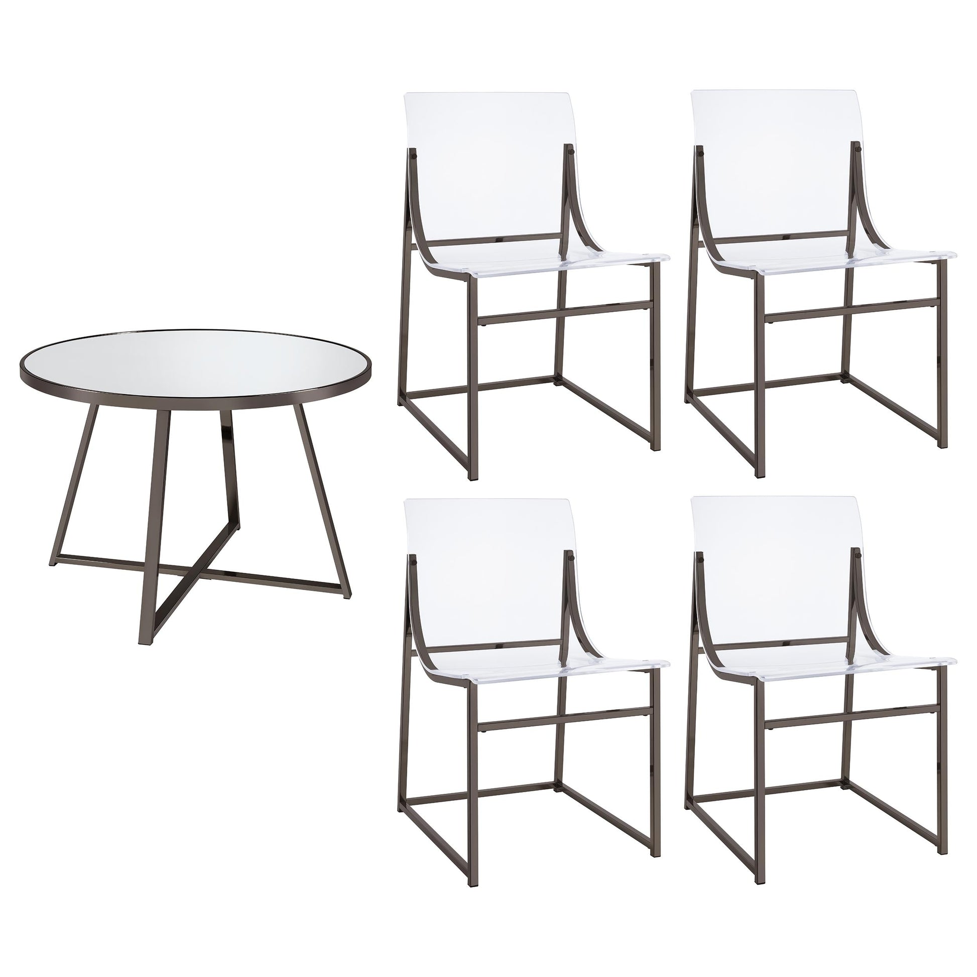 Rehaussez votre expérience culinaire avec cet ensemble de salle à manger cinq pièces au design saisissant, alliant design contemporain et élégance moderne. La pièce maîtresse est une table à manger ronde, dotée d'un plateau en verre miroir élégant et soutenue par des pieds angulaires à cadre ouvert qui ajoutent une touche de flair géométrique. Quatre chaises de salle à manger avant-gardistes complètent la table, redéfinissant le style moderne avec leurs dossiers en acrylique transparent et leurs cadres métalliques minimalistes. La finition nickel noir de la table et des chaises rehausse l'attrait sophistiqué de l'ensemble, le rendant parfait pour les repas décontractés comme pour les réceptions élégantes. Que vous organisiez des dîners ou savouriez un repas tranquille, cet ensemble de salle à manger transforme votre espace en une oasis chic.