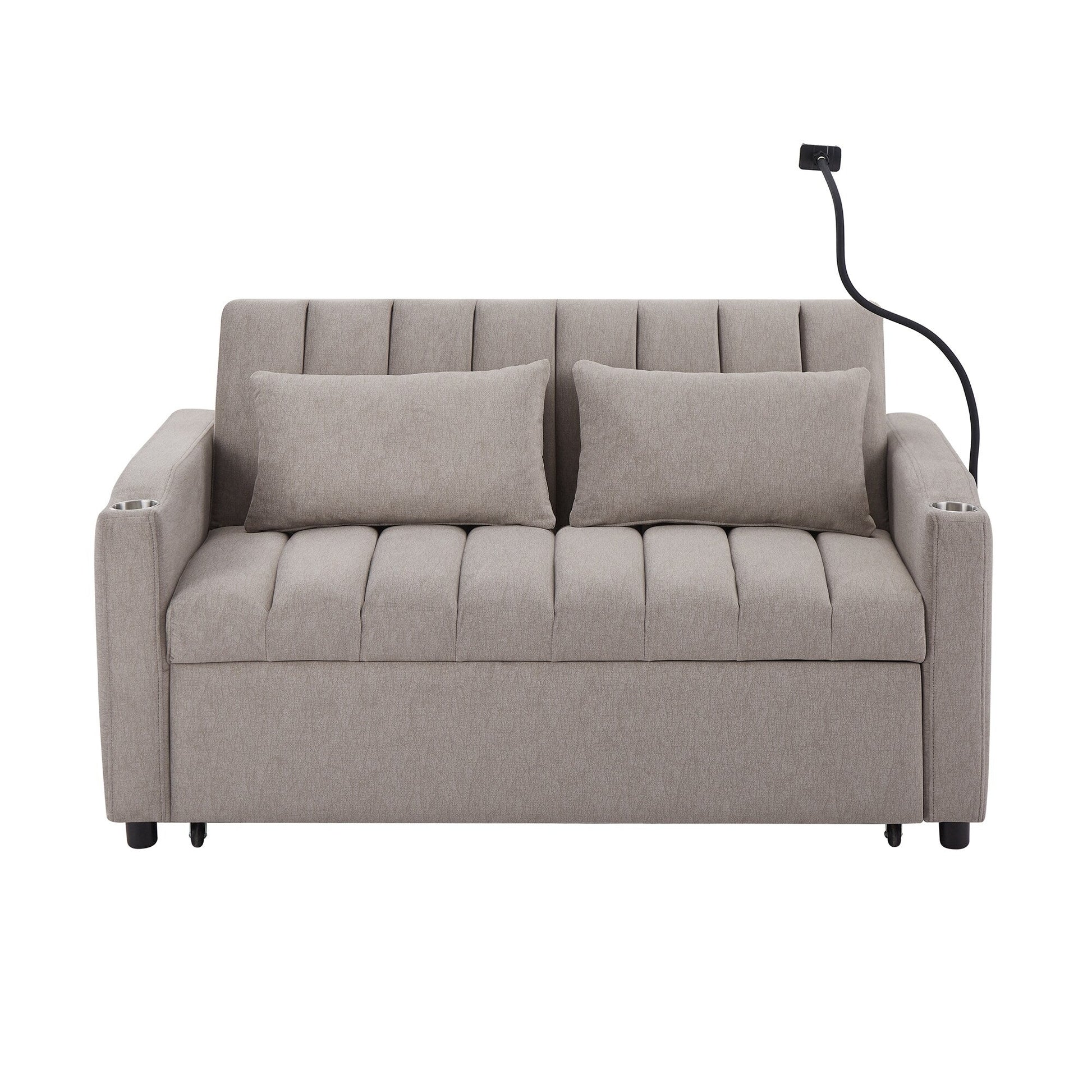 Canapé-lit convertible Roomfitters avec ports USB, poches latérales, porte-gobelets et support de téléphone pivotant pour salon.