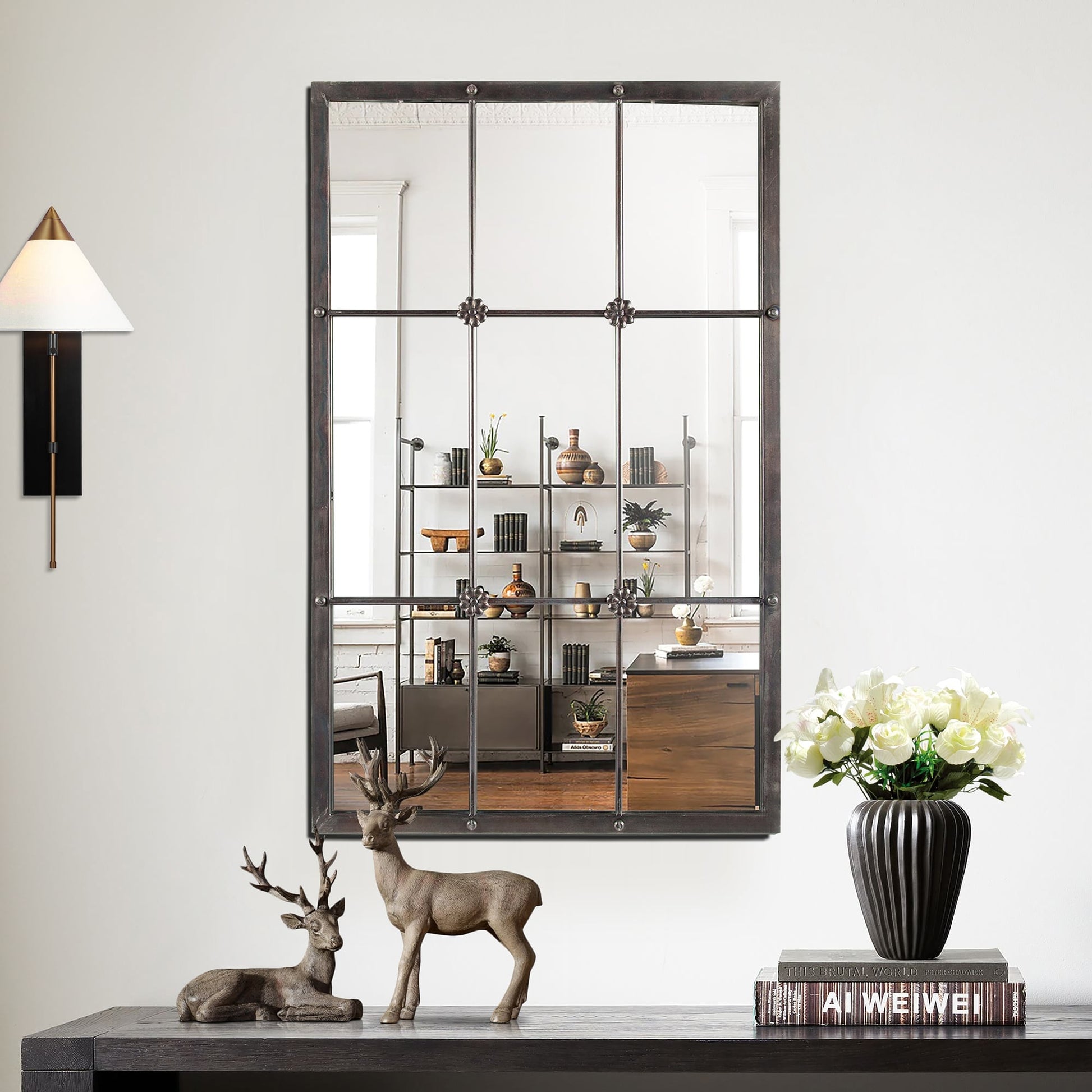 Las des murs fades ? Ce miroir mural à carreaux classique apportera instantanément de la lumière à votre intérieur et créera une illusion d'espace. Ce miroir mural rectangulaire présente un miroir unique derrière neuf sections de carreaux et est livré prêt à être accroché, le matériel de fixation étant inclus. Le miroir mural est prêt à être monté sur toute surface plane grâce aux languettes métalliques fixées à l'arrière du cadre. Le miroir peut être accroché horizontalement ou verticalement selon vos envies. Le cadre est en métal avec un miroir d'une seule pièce divisé en sections pour imiter une fenêtre. Illuminez votre intérieur avec ce magnifique miroir mural à carreaux. Le miroir possède un cadre en métal avec une finition brun rustique. Les carreaux sont ornés d'une fleur métallique au centre. Ce miroir mural constituera un point focal magnifique pour votre entrée, votre salon, votre couloir ou votre chambre à coucher.