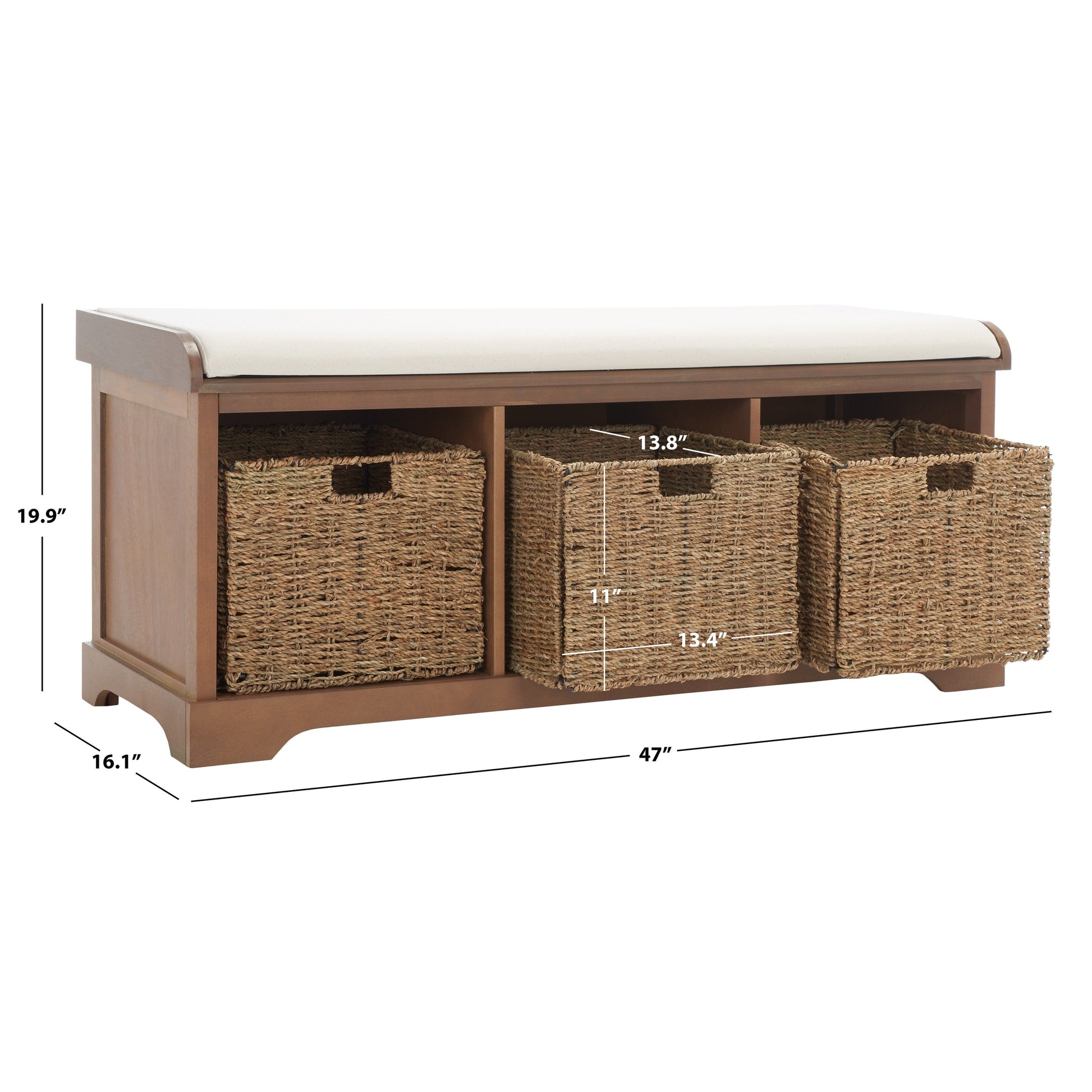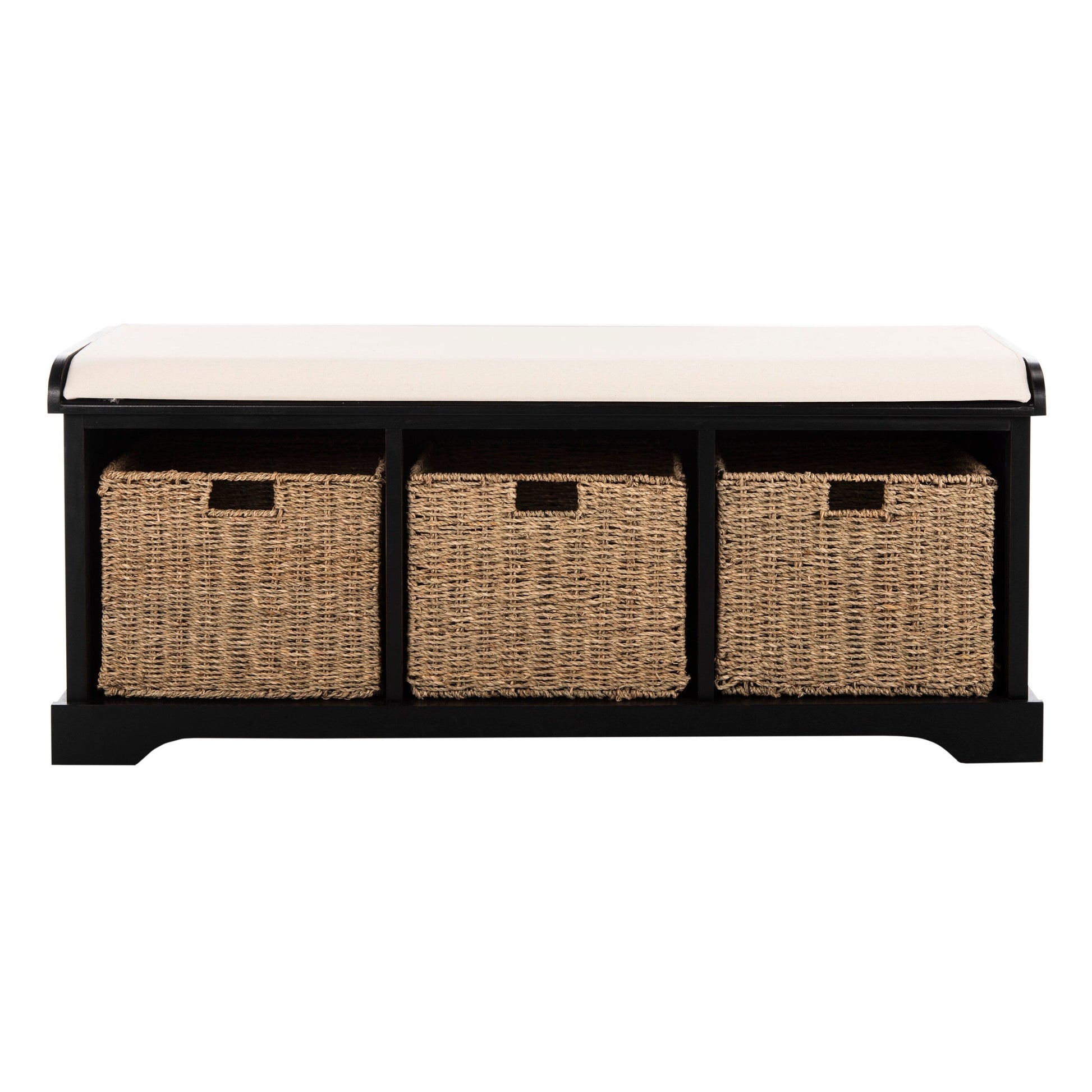 Le banc de rangement est l'endroit idéal pour enlever les bottes à l'entrée ou les chaussures de jardin dans le vestibule. Fabriqué en pin avec une finition lisse, ce meuble est doté de trois paniers tressés amovibles qui offrent un rangement pratique, et un coussin en coton blanc complète le look avec confort et charme de la ferme.