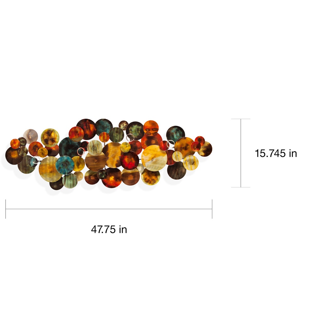 Illuminez votre décor avec cette sculpture brillante, fabriquée en tôle et peinte à la main avec un glacis réfléchissant. Des cercles superposés sont disposés sur des tubes métalliques et peints dans des teintes multicolores pour un look contemporain unique.