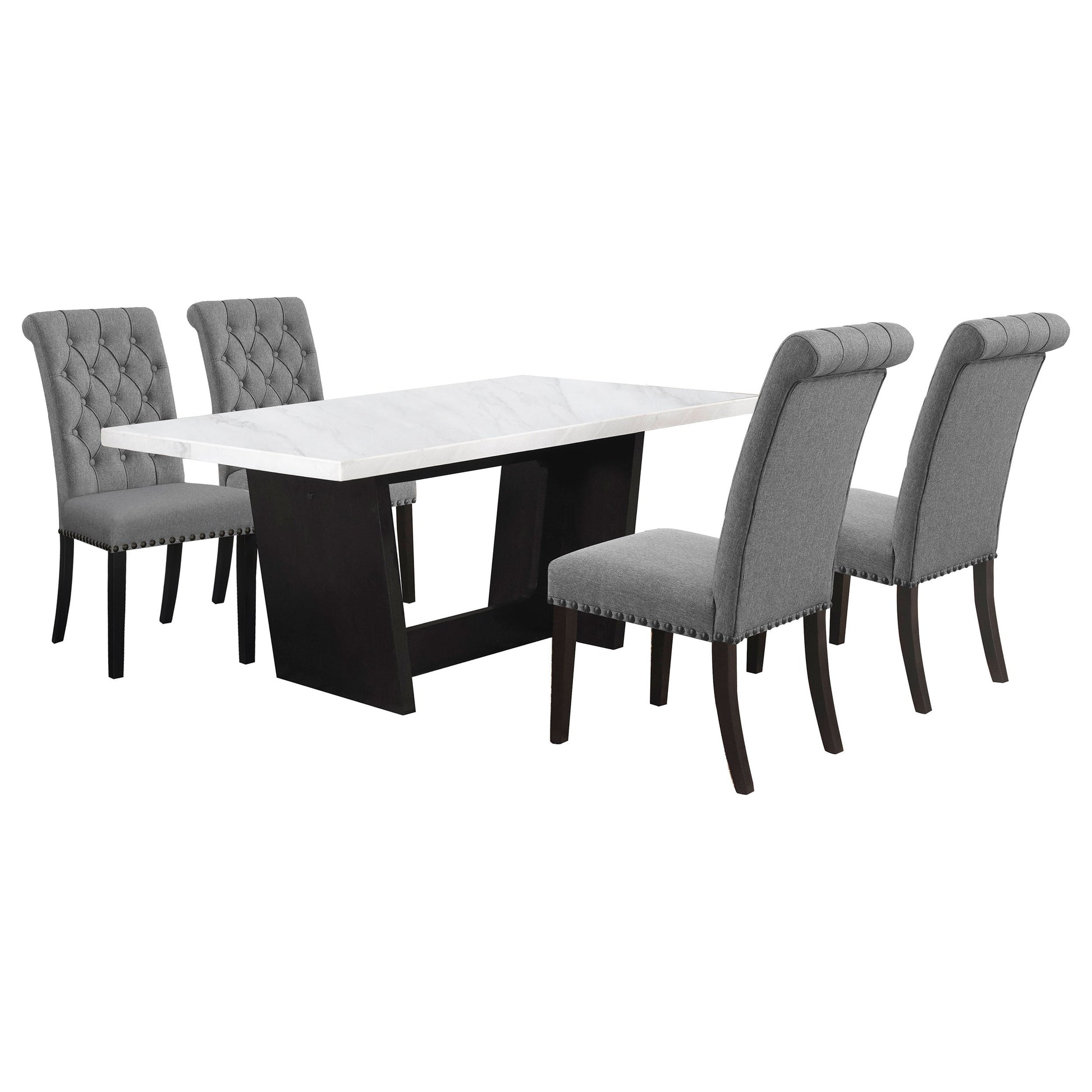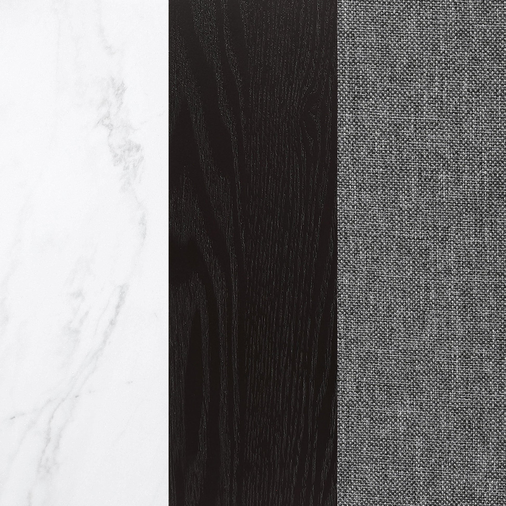 Réunissez famille et amis autour de ce set de table de style moderne et rustique. La table possède un plateau rectangulaire en marbre blanc épais, suffisamment spacieux pour six personnes. Le piètement à entretoises épuré et aéré, avec un motif ajouré central, et la combinaison de couleurs espresso rustique et éclatante apportent une touche spectaculaire et habillent la pièce avec élégance. Le set de chaises avec dossier incurvé et capitonnage boutonné confère une esthétique traditionnelle à l'espace. De plus, l'assise rembourrée avec des clous décoratifs individuels apporte à votre intérieur des éléments classiques et un charme certain.