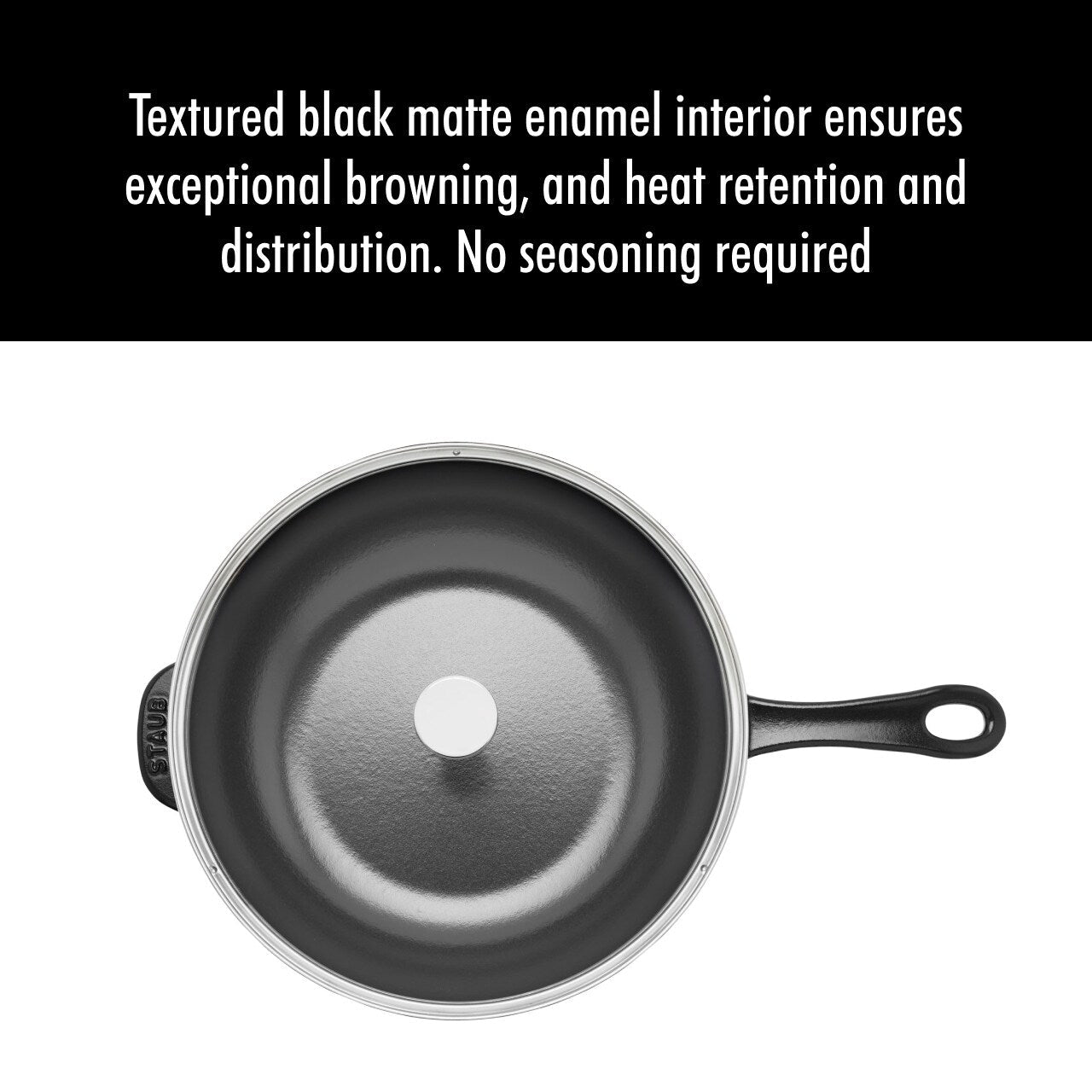 - L'intérieur en émail noir mat texturé ne nécessite aucun assaisonnement et assure un brunissage, une rétention et une répartition de la chaleur exceptionnels.