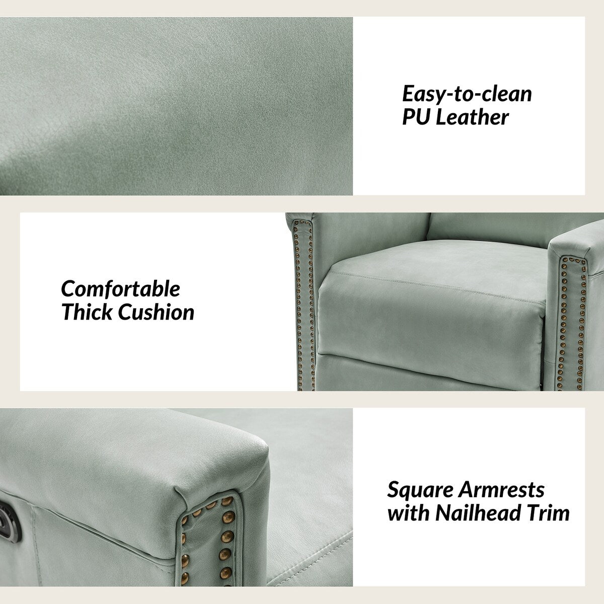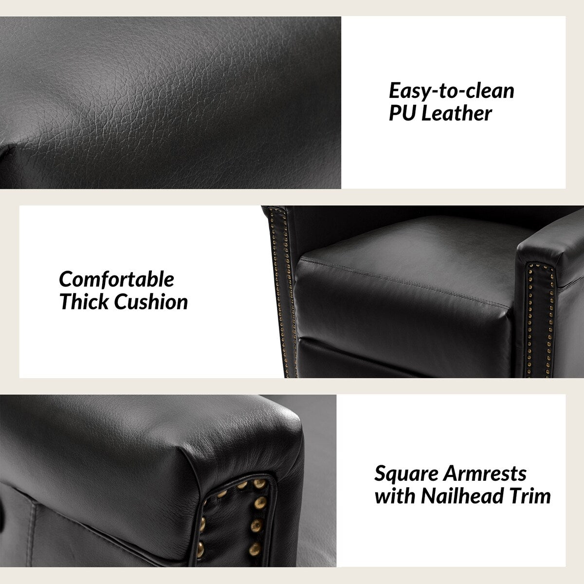 - Finition en clous de cuivre : Ornant les bords du cadre du ensemble de fauteuils inclinables, la finition en clous de cuivre ajoute une touche de sophistication et de raffinement, accentuant le charme traditionnel du ensemble de fauteuils inclinables et conférant une esthétique luxueuse au design global.