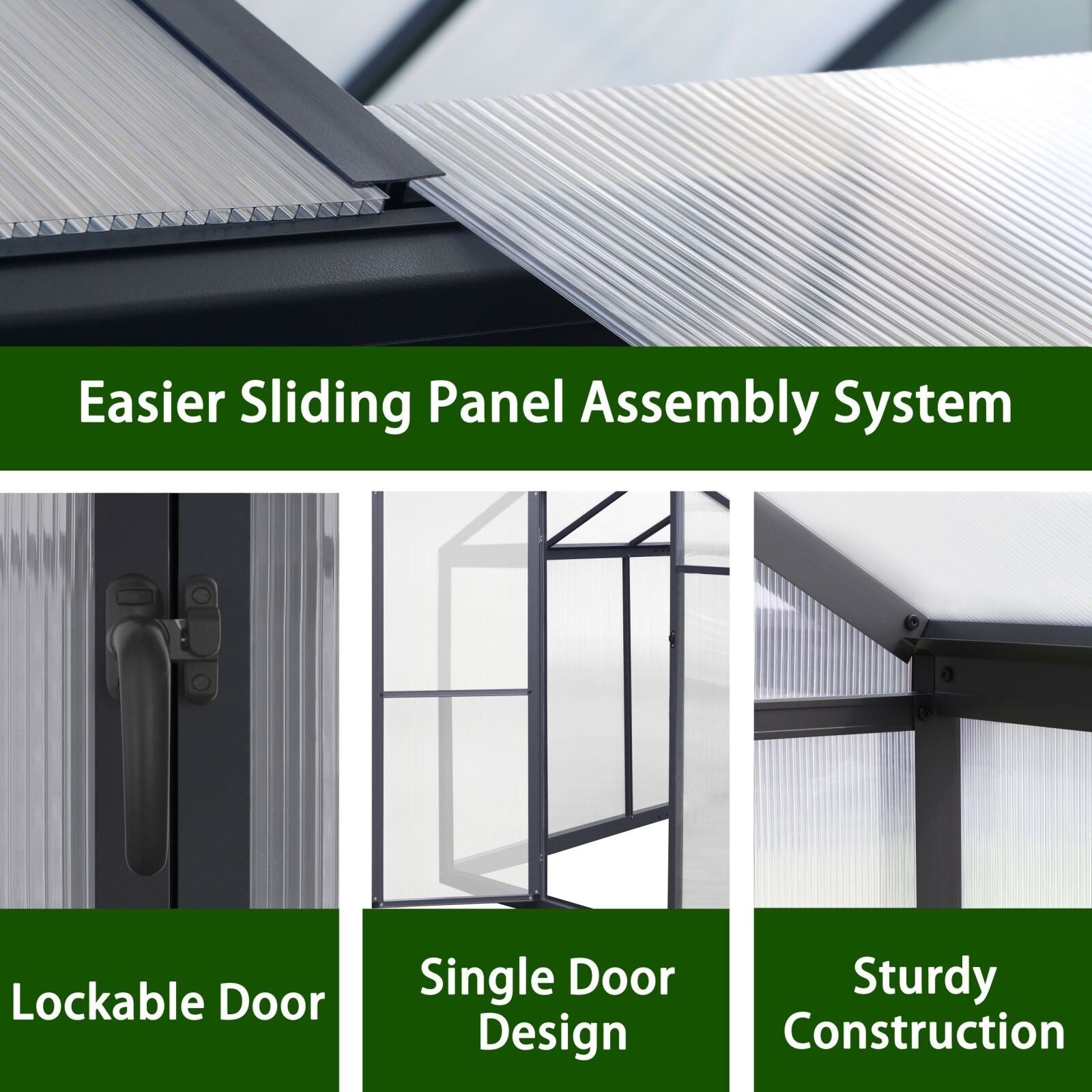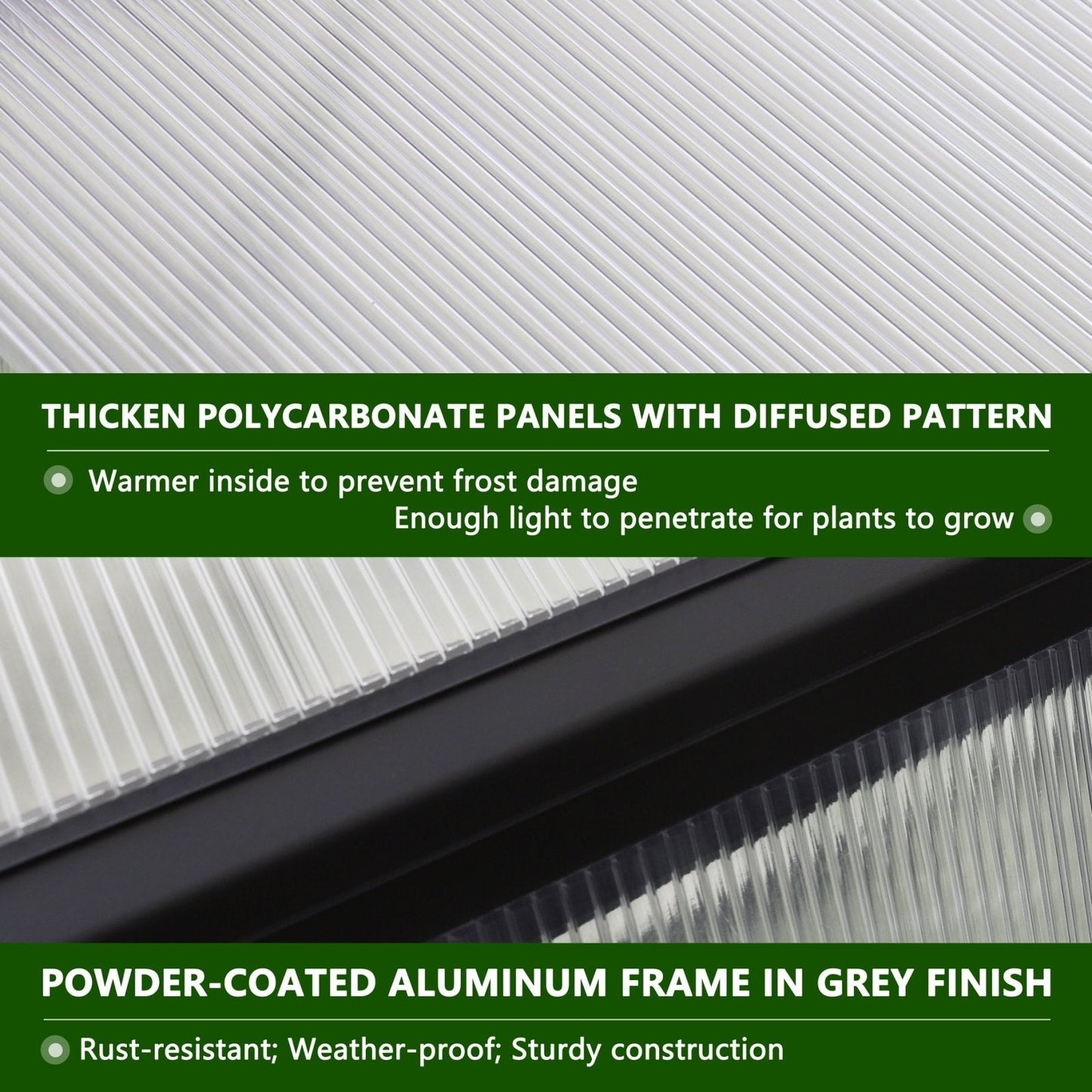 La serre en aluminium est équipée de panneaux de polycarbonate résistants aux UV qui protègent non seulement vos plantes des rayons UV nocifs, mais garantissent également leur croissance optimale. Cette caractéristique permet à vos plantes de prospérer toute l'année, quel que soit votre emplacement.