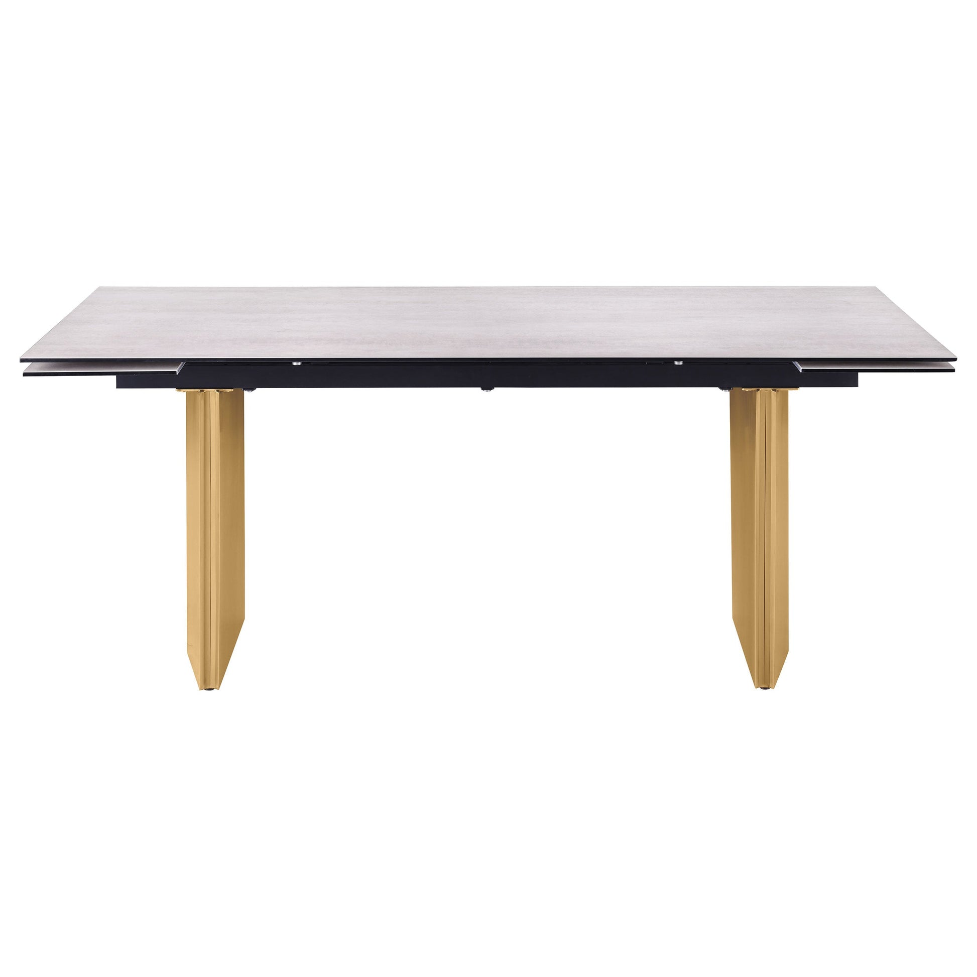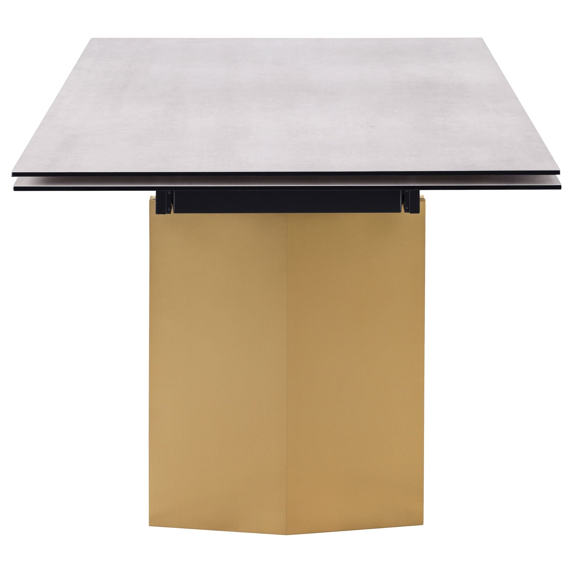 Cette table à manger moderne présente un magnifique plateau en verre beige avec un motif imprimé en 3D, supporté par une base en acier inoxydable doré brossé pour un look sophistiqué et luxueux. Idéale pour recevoir, la table est dotée de deux rallonges réfractaires de 30 cm (12 pouces) à chaque extrémité, permettant d'agrandir facilement la capacité d'assise pour les plus grandes réunions. La combinaison de matériaux élégants, de finitions raffinées et de lignes épurées fait de cette table un élément phare pour les espaces repas contemporains, alliant beauté et fonctionnalité.
